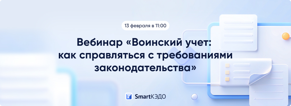 13 февраля в 11:00 приглашаем вас на вебинар «Воинский учет: как справляться с требованиями законодательства с помощью SmartКЭДО»